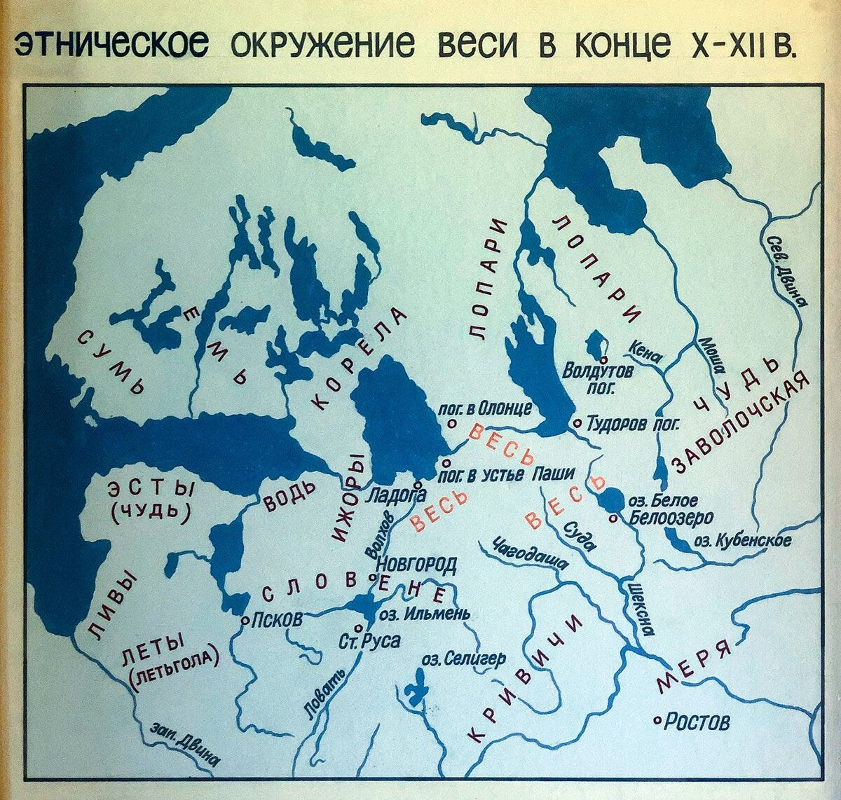 Живший вокруг озера Ильмень союз племён, по легенде призвавший на княжение Рюрика, состоял не только из славян. В него входили чудь, словене, кривичи и весь. Словене — это, как мы знаем, новгородцы, кривичи — псковичи, а вот весь и чудь — прибалтийско-финские народы. Весью славяне называли вепсов, а чудь — собирательное название, в которое в разное время включали разные племена: эстов, корелу, ижору, водь, нарову, сету и тех же вепсов.