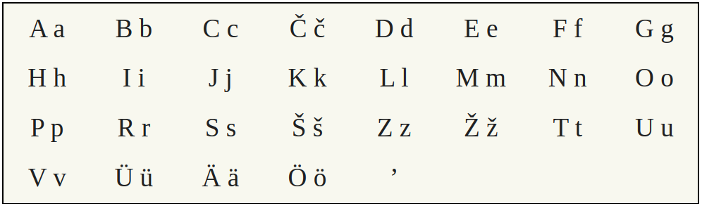 А, Ä, B, C, Č, D, E, F, G, H, I, J, K, L, M, N, O, Ö, P, R, S, Š, T, U, Ü, V, X, Y, Z, Ž